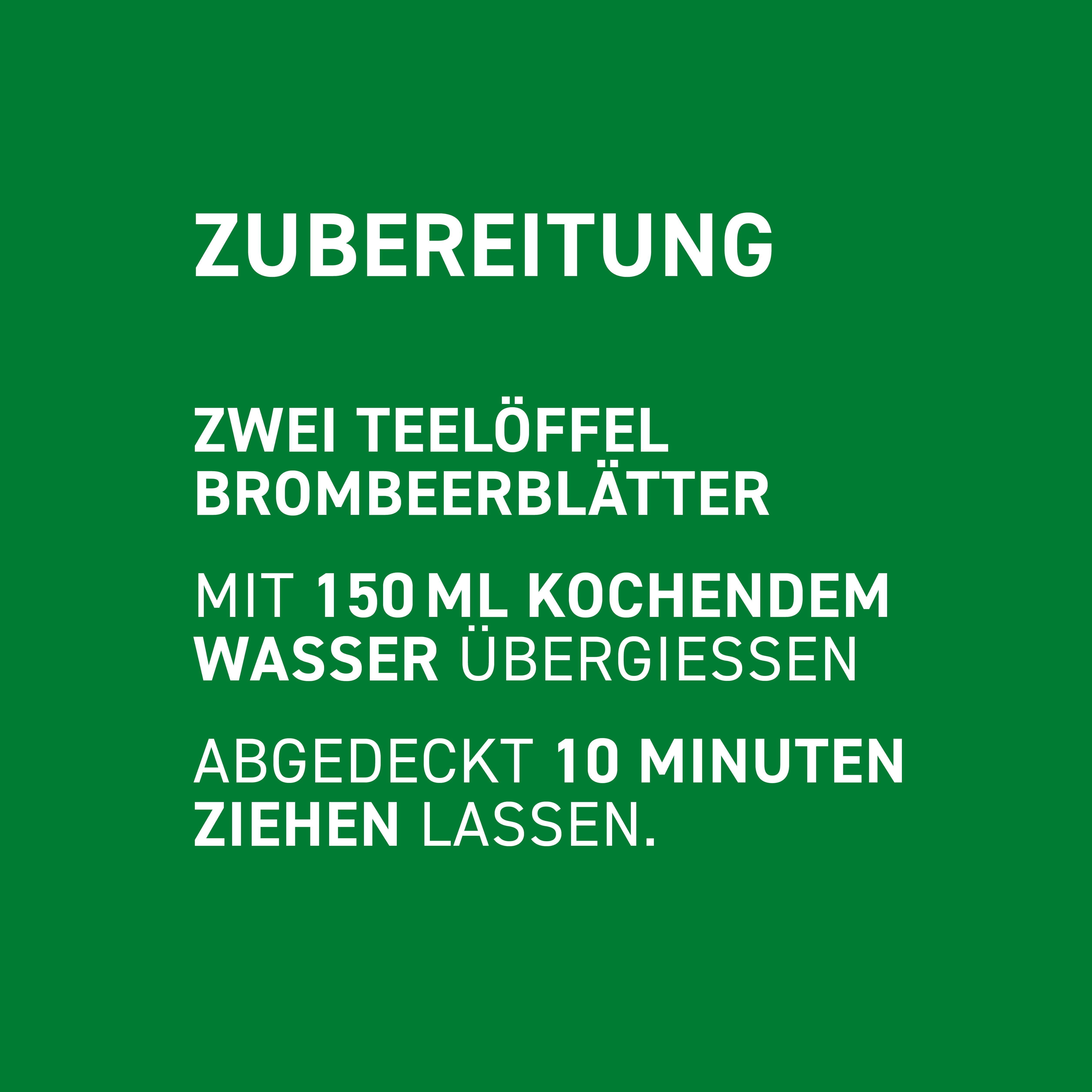Zwei Teelöffel Brombeerblätter mit 150 ml kochendem Wasser übergiessen und dann abgedeckt 10 Minuten ziehen lassen. Brombeerblättertee kann jederzeit warm oder kalt getrunken werden.
