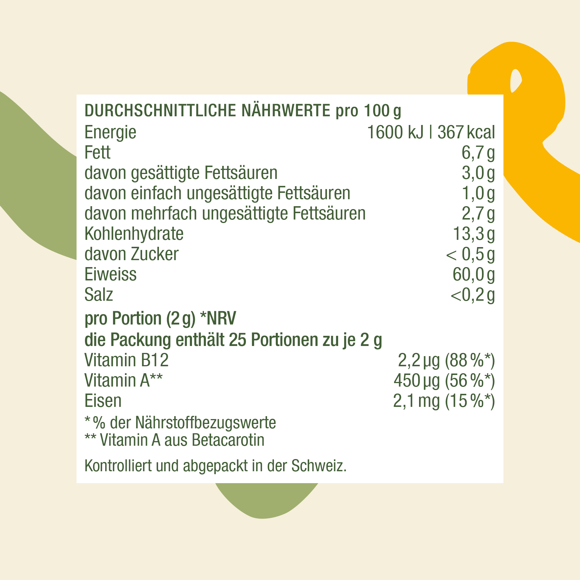 Über 60 % Protein, essentielle Aminosäuren, Eisen, Magnesium, Zink und Phycocyanin.