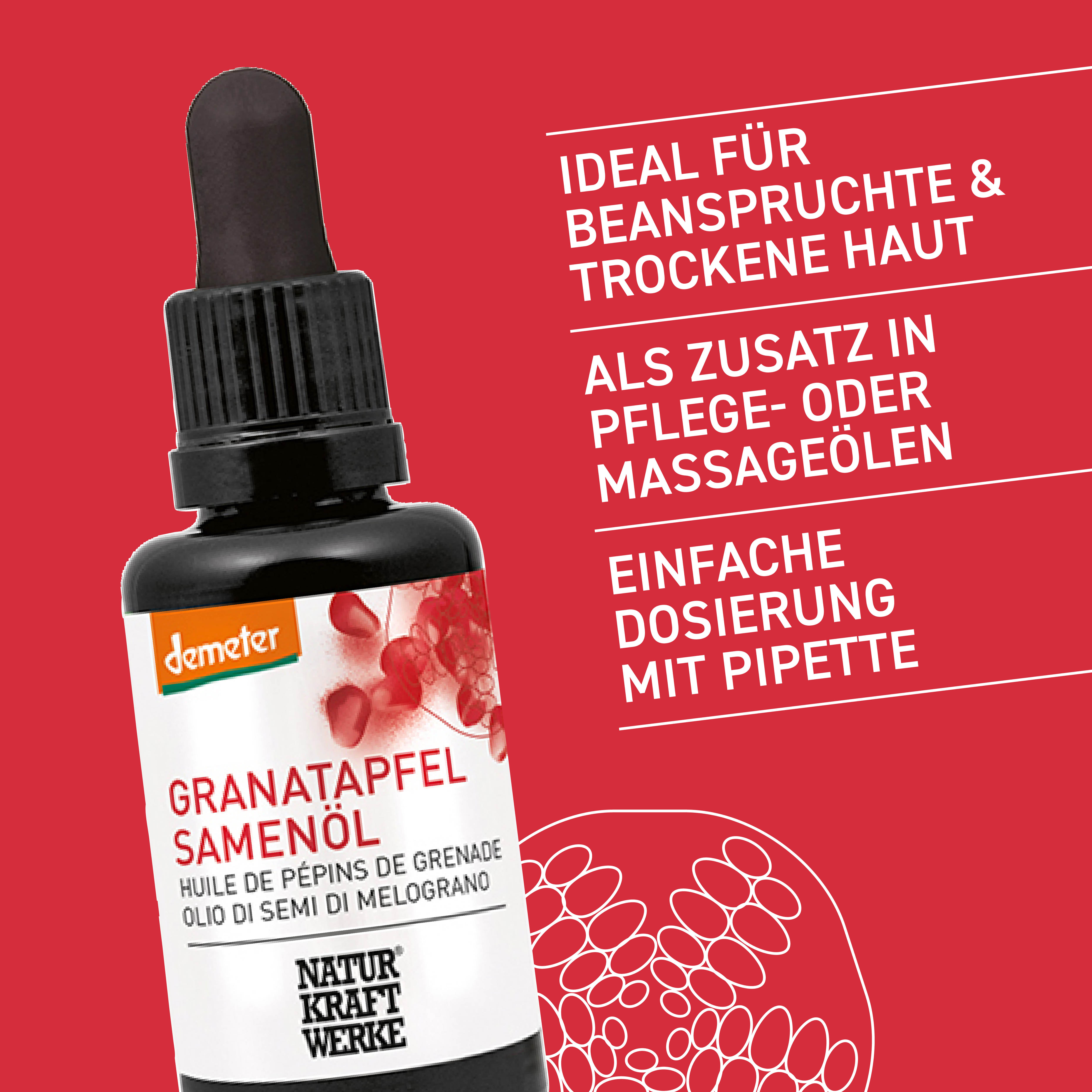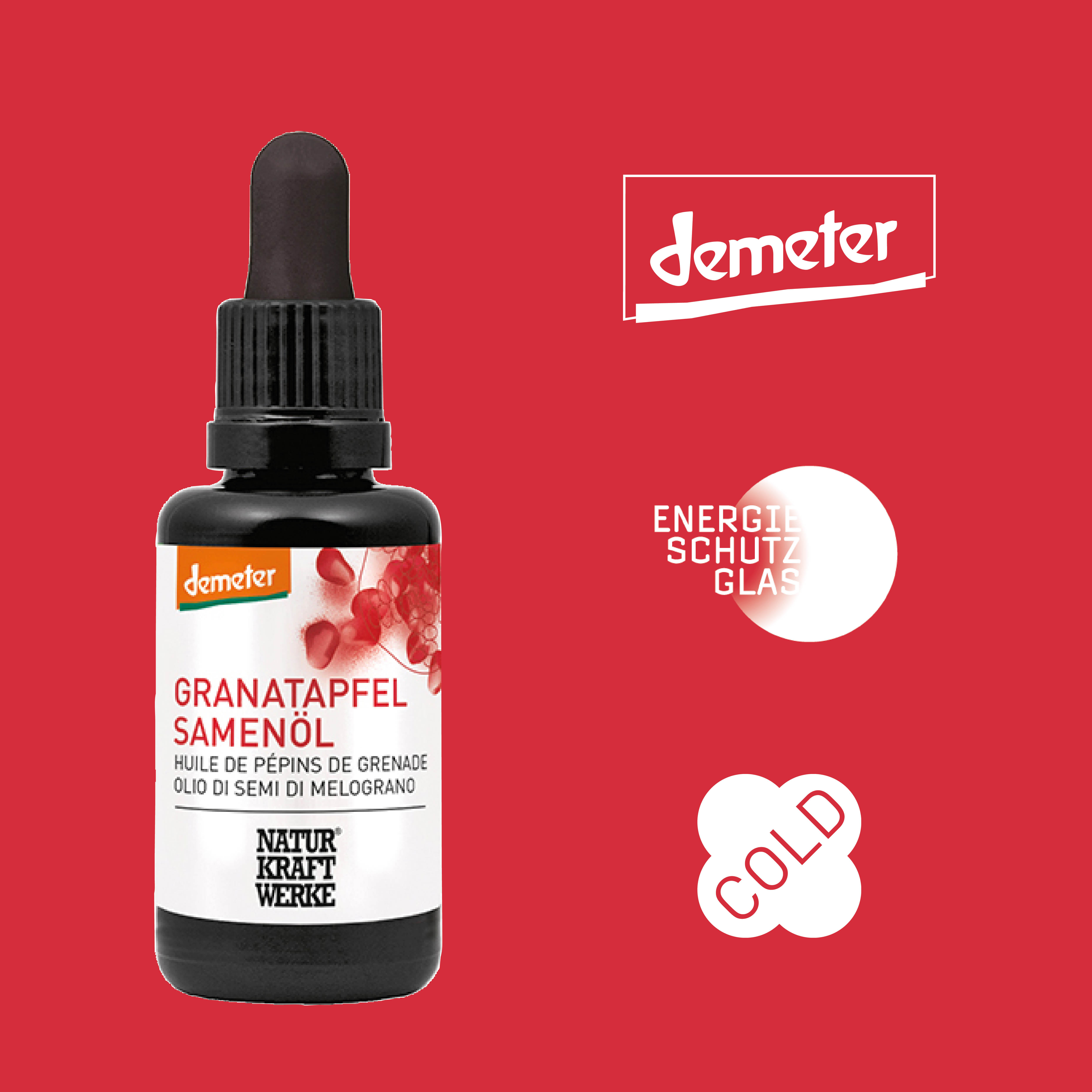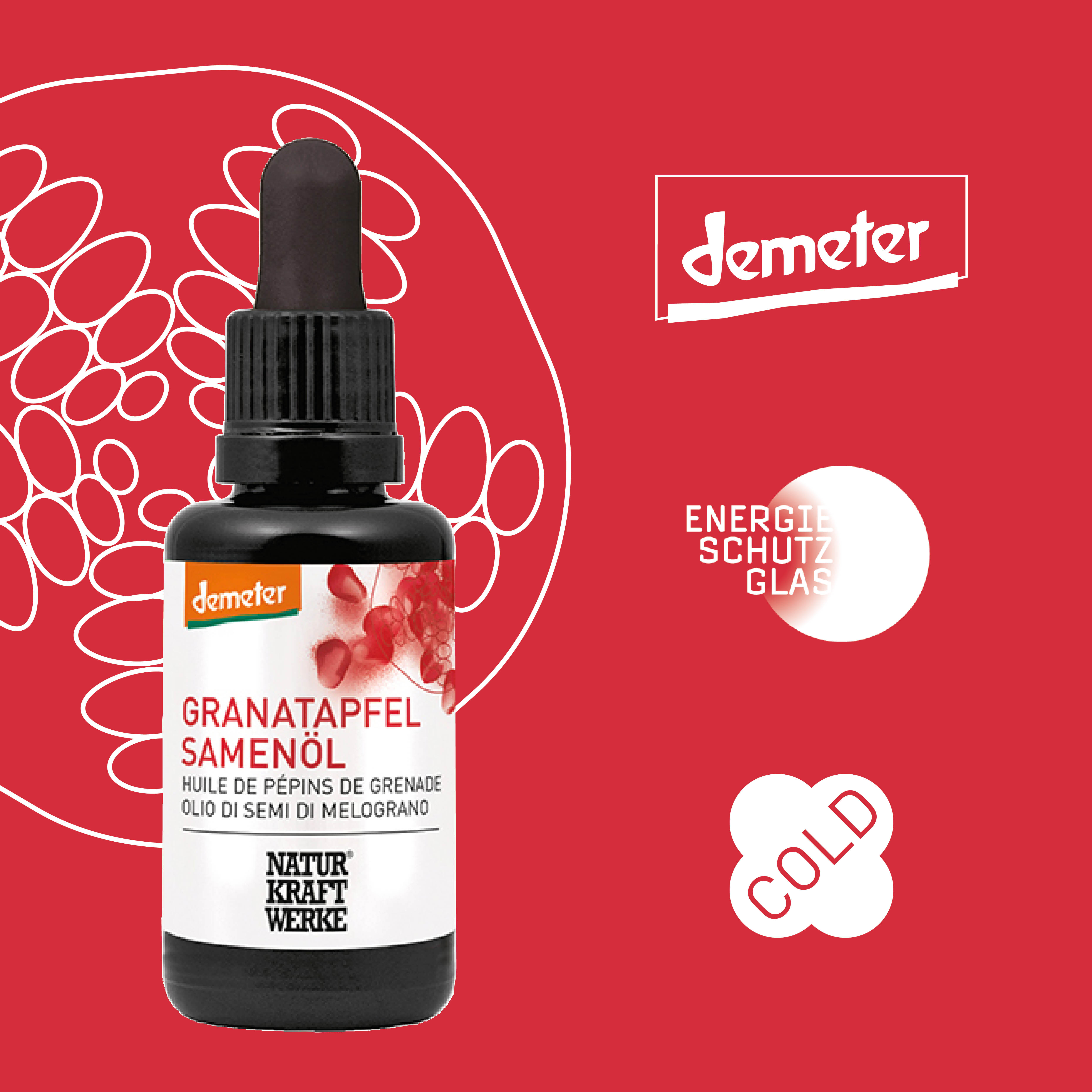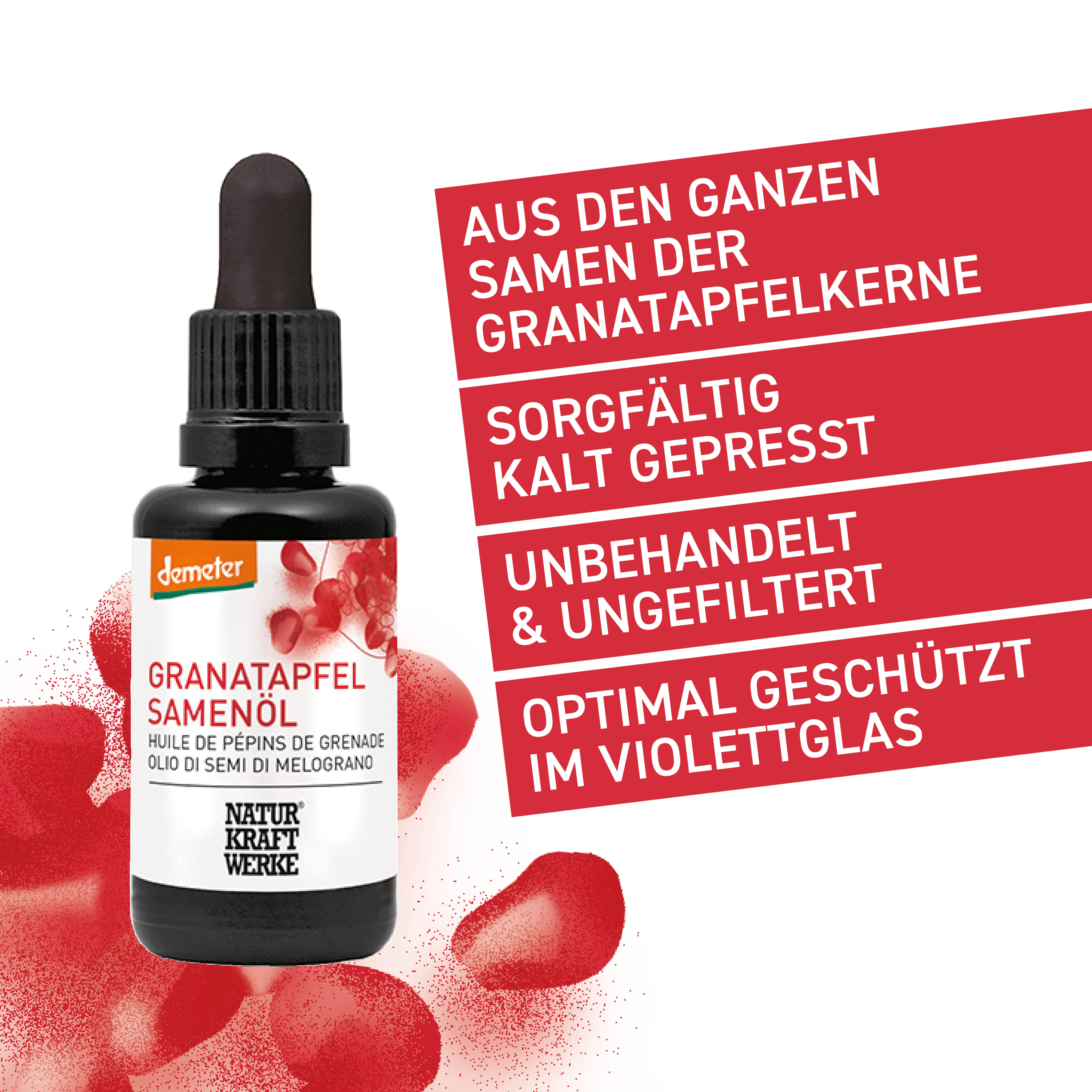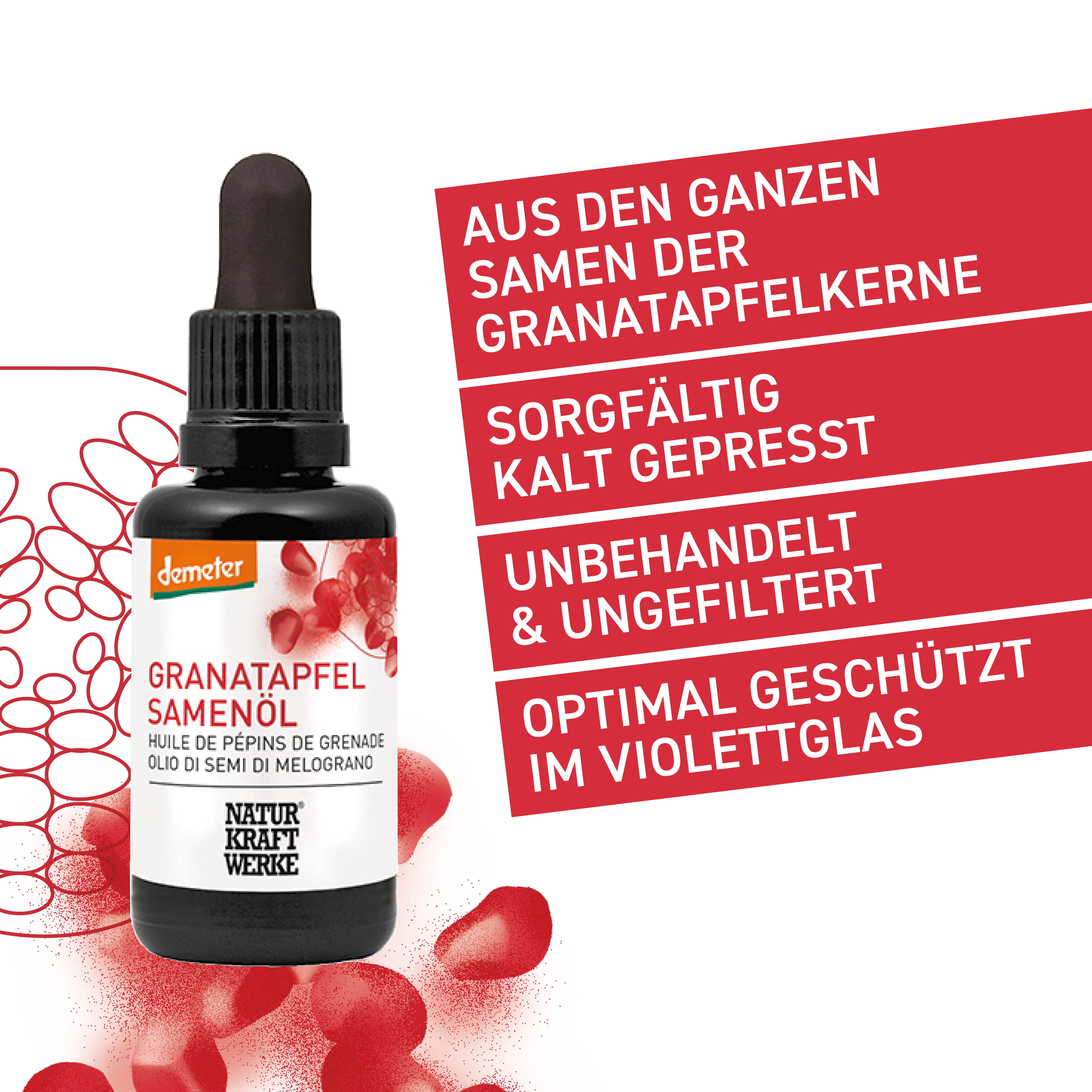 Das NaturKraftWerke Granatapfelsamenöl wird aus den Samen der Granatapfelkerne gewonnen. Aus den frischen roten Kernen der Demeter Granatäpfel wird Saft gepresst. Die zurückbleibenden Kerne werden schonen getrocknet und zur Ölgewinnung verwendet. Das Öl wird sorgfältig kalt gepresst und unbehandelt und unfiltriert abgefüllt. Das viskose Öl mit arttypischem Geruch ist im Violettglas optimal geschützt und lässt sich mit der dazugehörigen Pipette einfach und leicht dosieren.