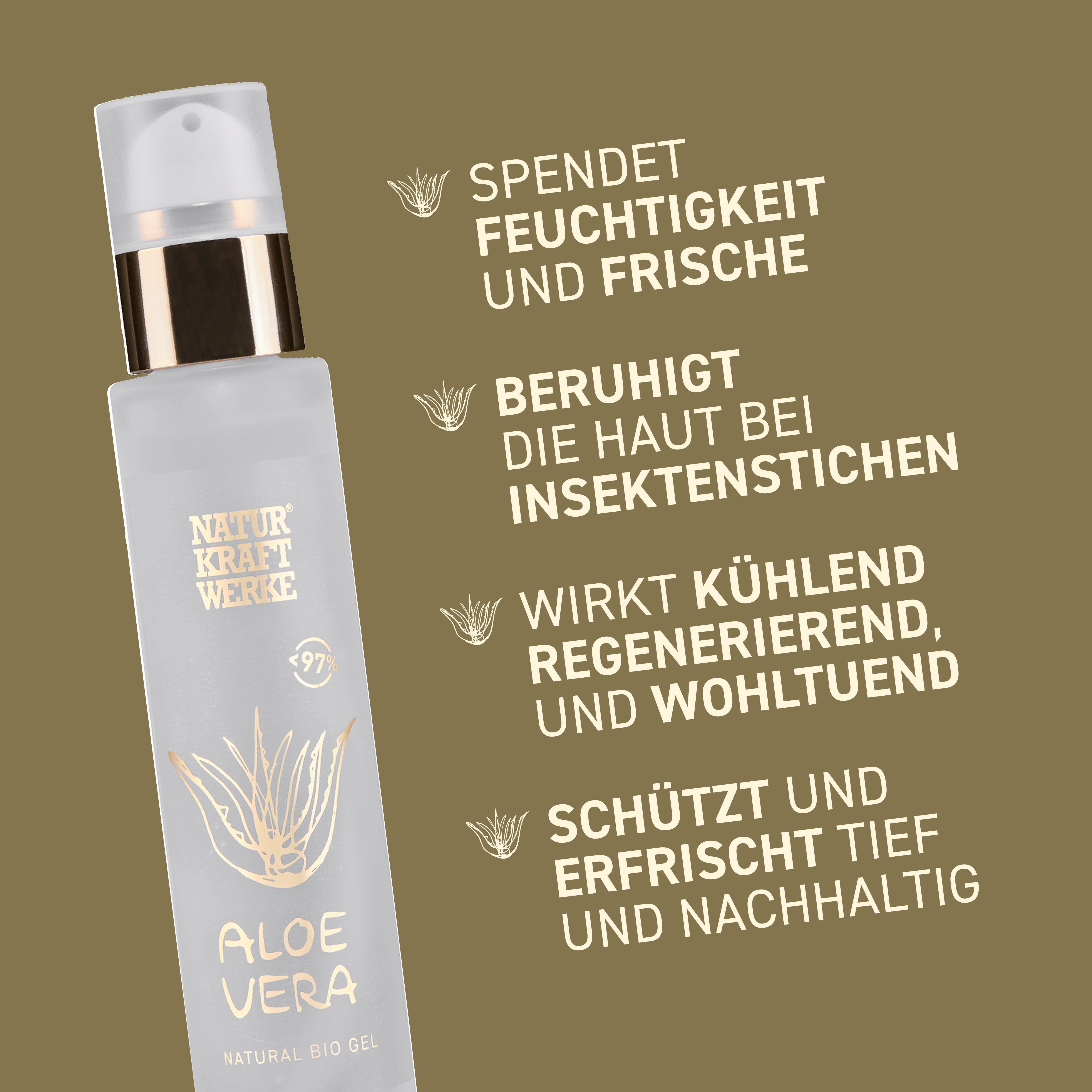 Das Gel mit reinem Bio Aloe Vera Extrakt spendet Feuchtigkeit und Frische. Nach dem Sonnenbad, bei Insektenstichen aber auch in der täglichen Hautpflege wirkt das Gel regenerierend, wohltuend und kühlend. Das Gel zieht schnell und komplett in die Haut ein, es schützt und erfrischt tief und nachhaltig.
