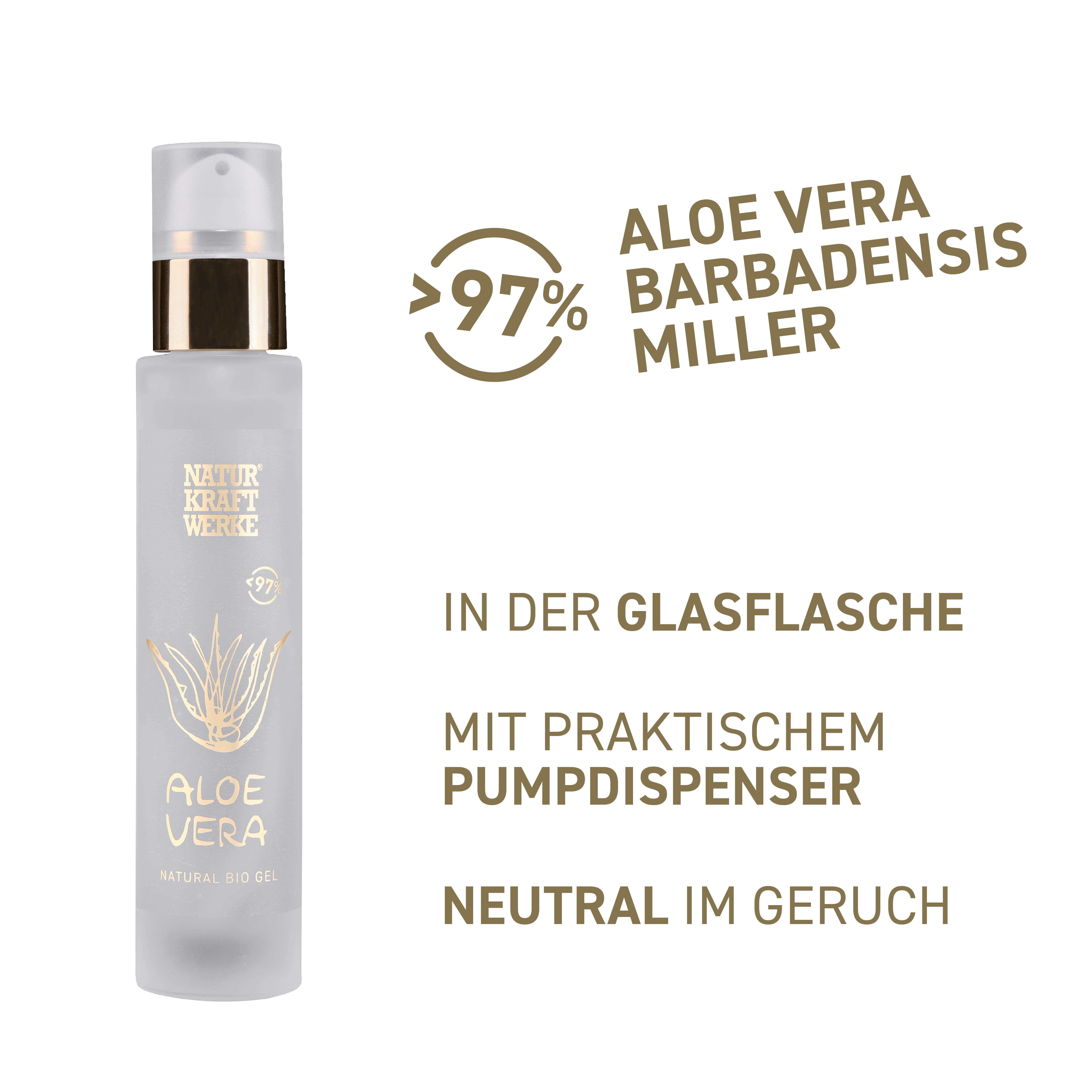 Entstanden ist dieser praktische NaturKraftWerke Aloe Vera Gel Natural. 100 % Bio-Kosmetik. 97,3 % Bio-Aloe-Extrakt. In der Glas-Flasche.