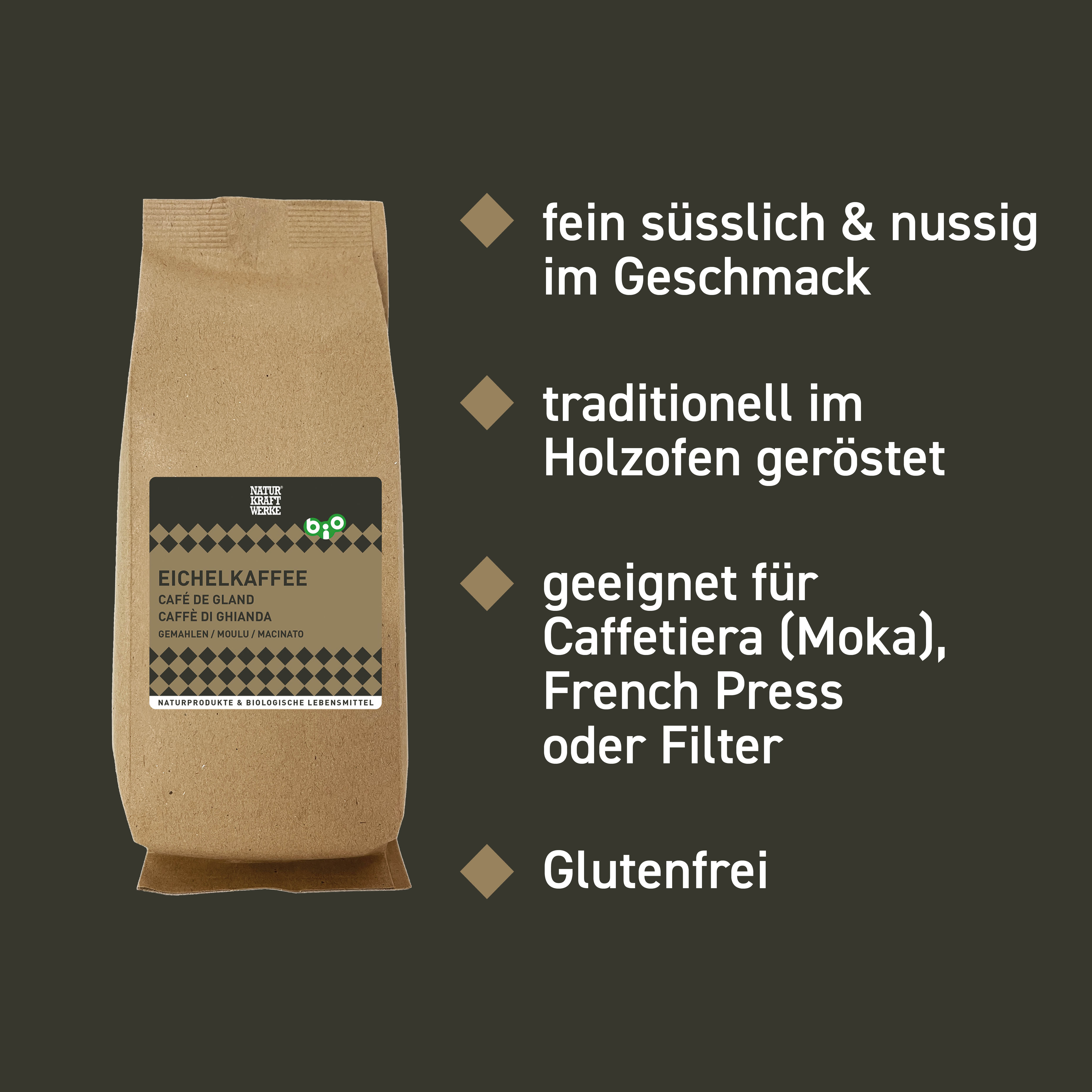 Der Eichelkaffee eignet sich für die Zubereitung in der italienischen Kaffeemaschine (Caffetiera/Moka). Natürlich kann der Kaffee auch in der Stempelkanne (French Press) oder mit Filter zubereitet werden: hierfür 2-3 EL auf ½ Liter Wasser oder 2-3 Teelöffel auf eine Tasse Wasser. Heiss überbrühen.