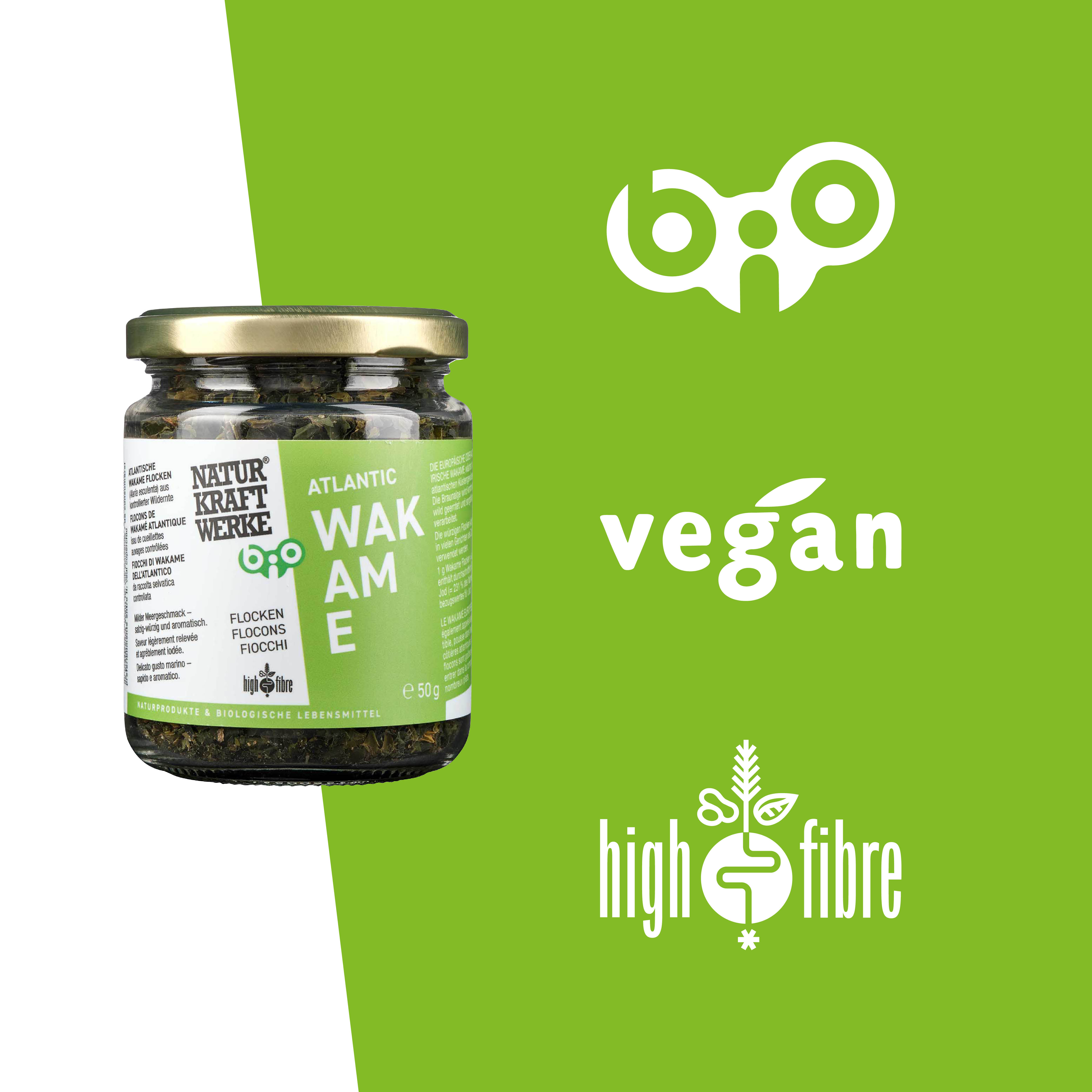 Wakame-Flocken bringen Abwechslung in die Küche und sind ausserdem ein nachhaltiger und umweltfreundlicher Lieferant von natürlichem Jod, Eisen, Kalium, Calcium, Zink und vielen Ballaststoffen. Durchschnittlich 49 g Ballaststoffe sind in 100 g getrockneten Wakame-Flocken enthalten.