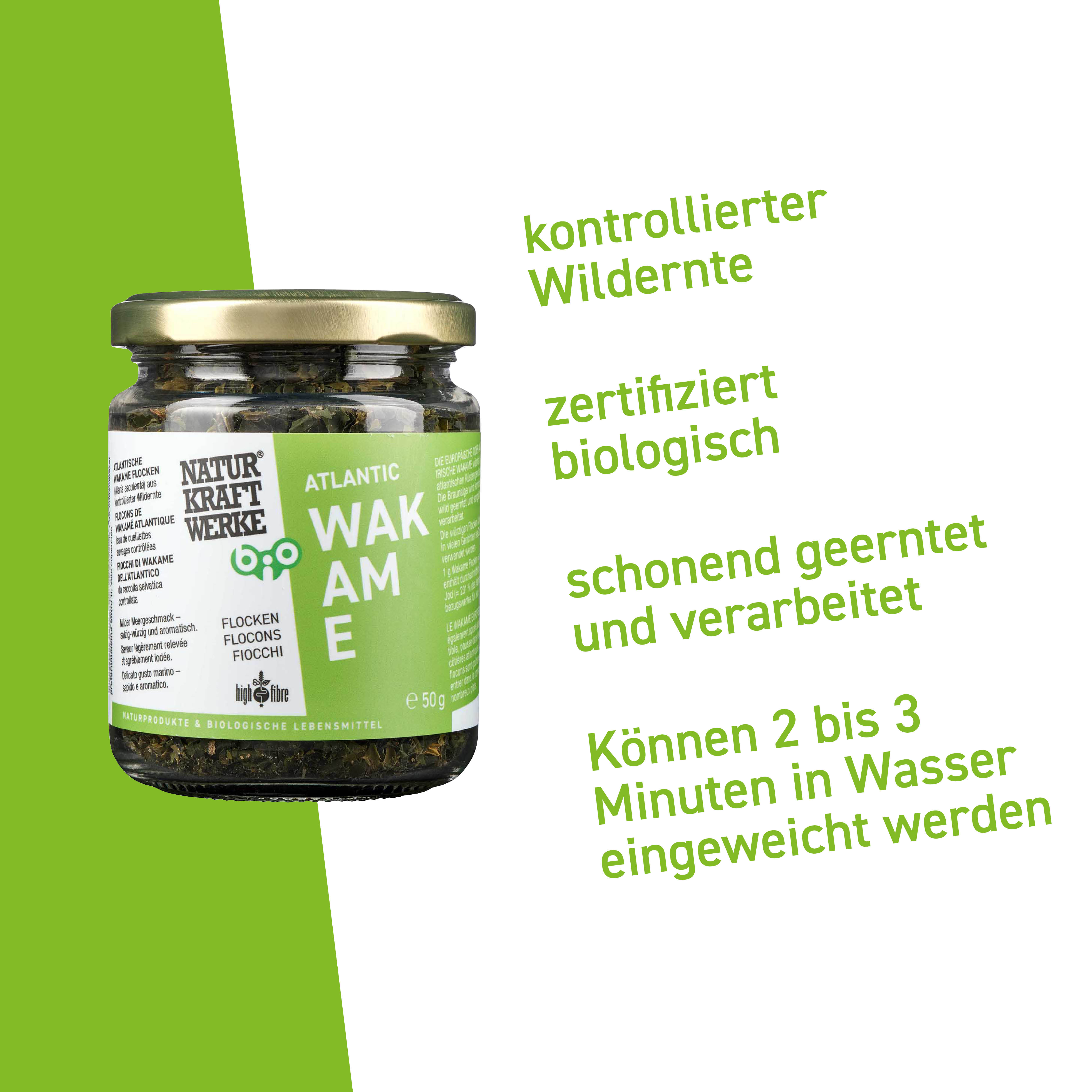 Die NaturKraftWerke Wakameflocken kommen aus irischen und färöischen Gewässern. Atlantische Wakamealgen sind eine schmackhafte Zutat für viele Speisen. Die Flocken können einfach über fertige Speisen wie zum Beispiel Nudelsuppen gestreut werden. Auch leicht geröstet oder kurz eingeweicht lassen sie sich zubereiten.