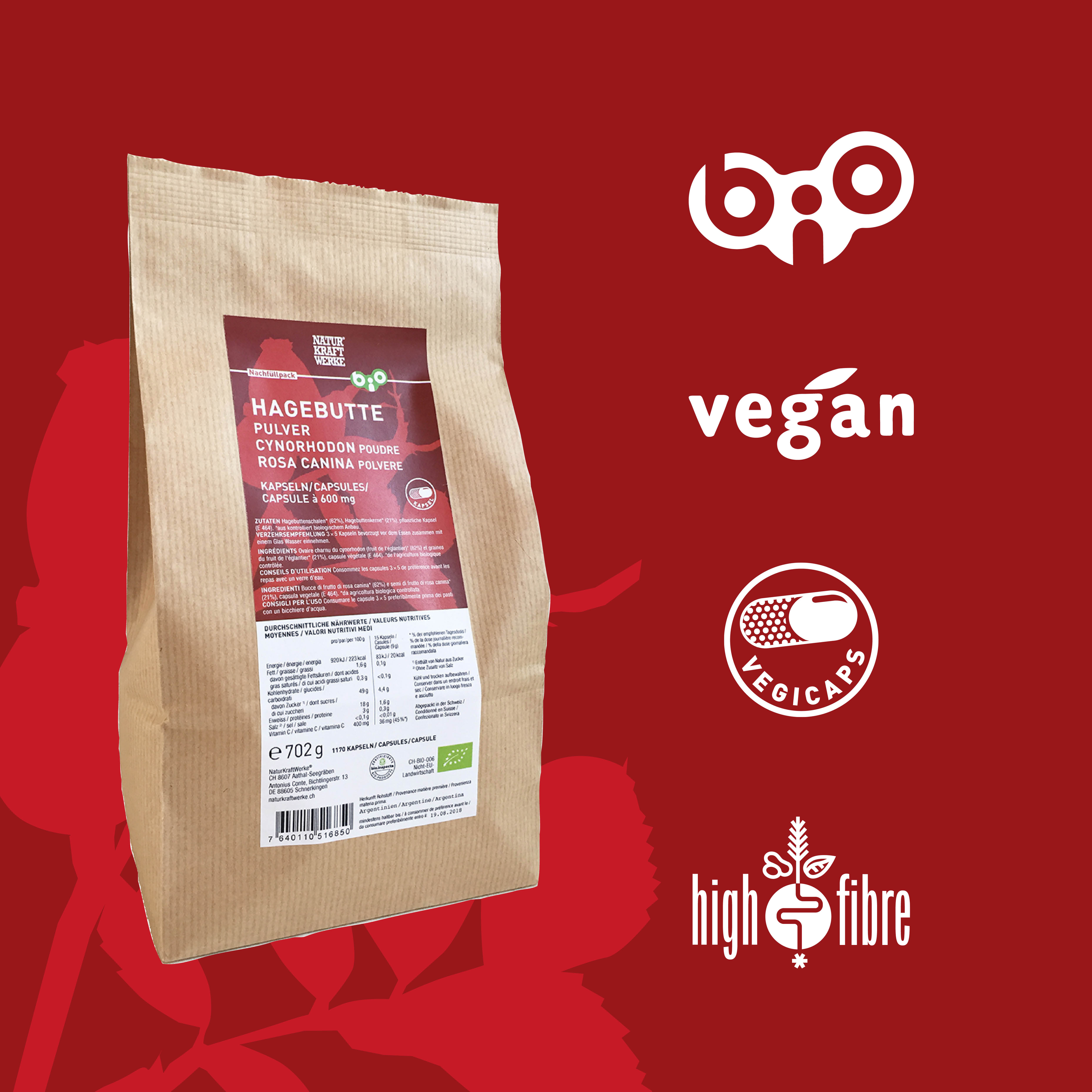 Wir bieten das Hagebuttenpulver in Vegicaps in verschiedenen Packungsgrössen an.