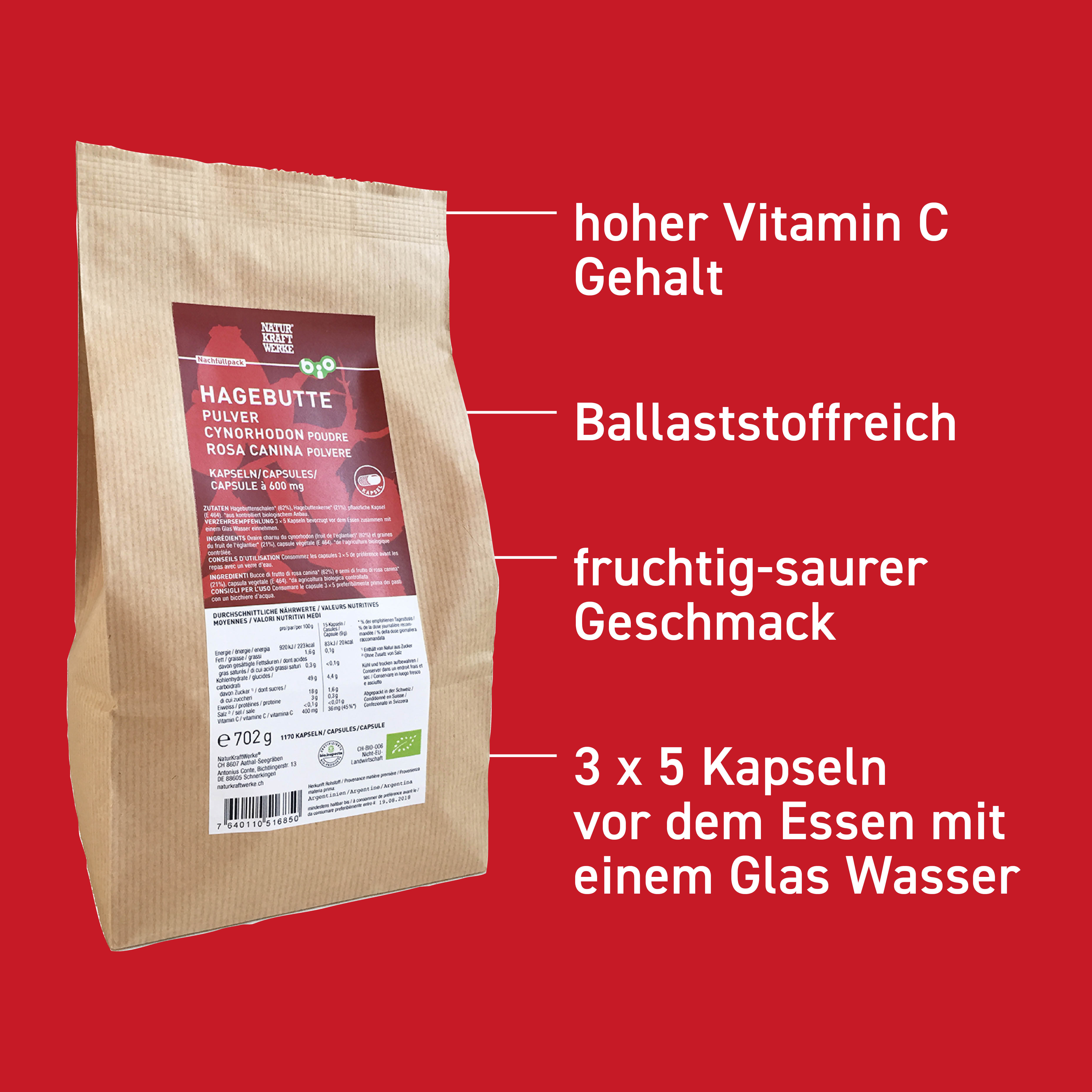 - 100 % Rosa canina Fruchtpulver in pflanzlichen Cellullosekapseln