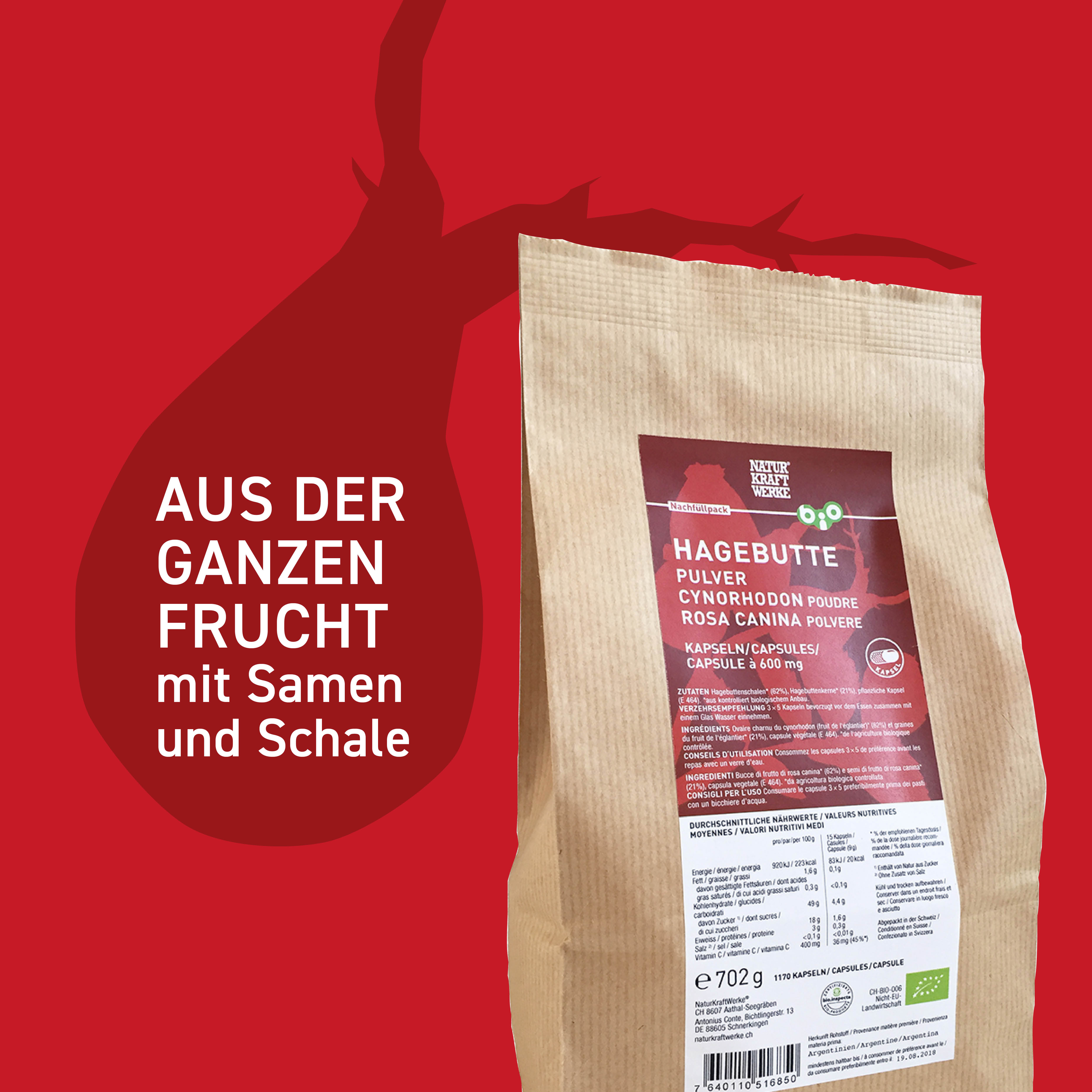 Seit vielen Jahren ist Hagebuttenpulver bekannt und beliebt. Verschiedenste Anwendungen sind beschrieben. Neben dem natürlichen Vitamin C enthält die Hagebuttenfrucht zahlreiche weitere Pflanzenstoffe, welche alle natürlich gebunden und unverändert in diesem reinen Fruchtpulver vorkommen. Ausserdem ist das Vitamin C in der Hagebutte aussergewöhnlich hitzestabil, weshalb es auch in deinen Porridge oder in den Kuchen, ins Brot, in die Suppe passt.