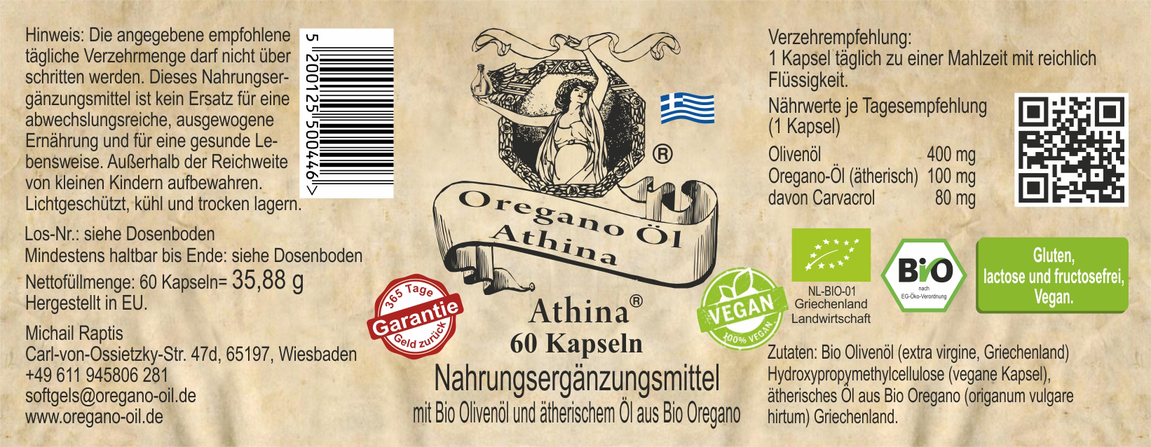 Für die Athina Oregano Öl Kapseln werden nur rein natürliche Zutaten verwendet. Neben dem reinen ätherischen Oreganoöl (100 mg / Kapsel) sind noch extranatives Olivenöl -ebenfalls aus Griechenland - enthalten.