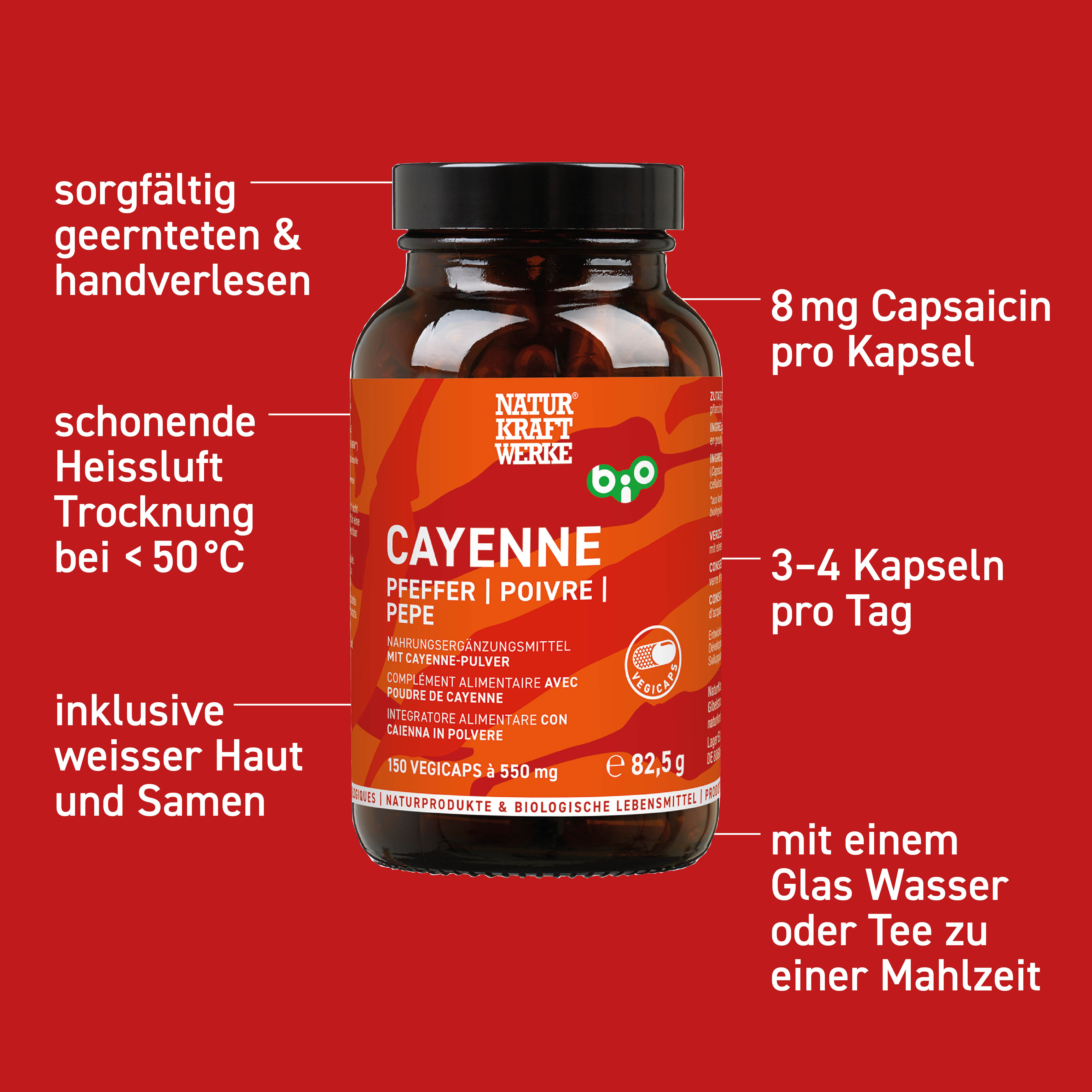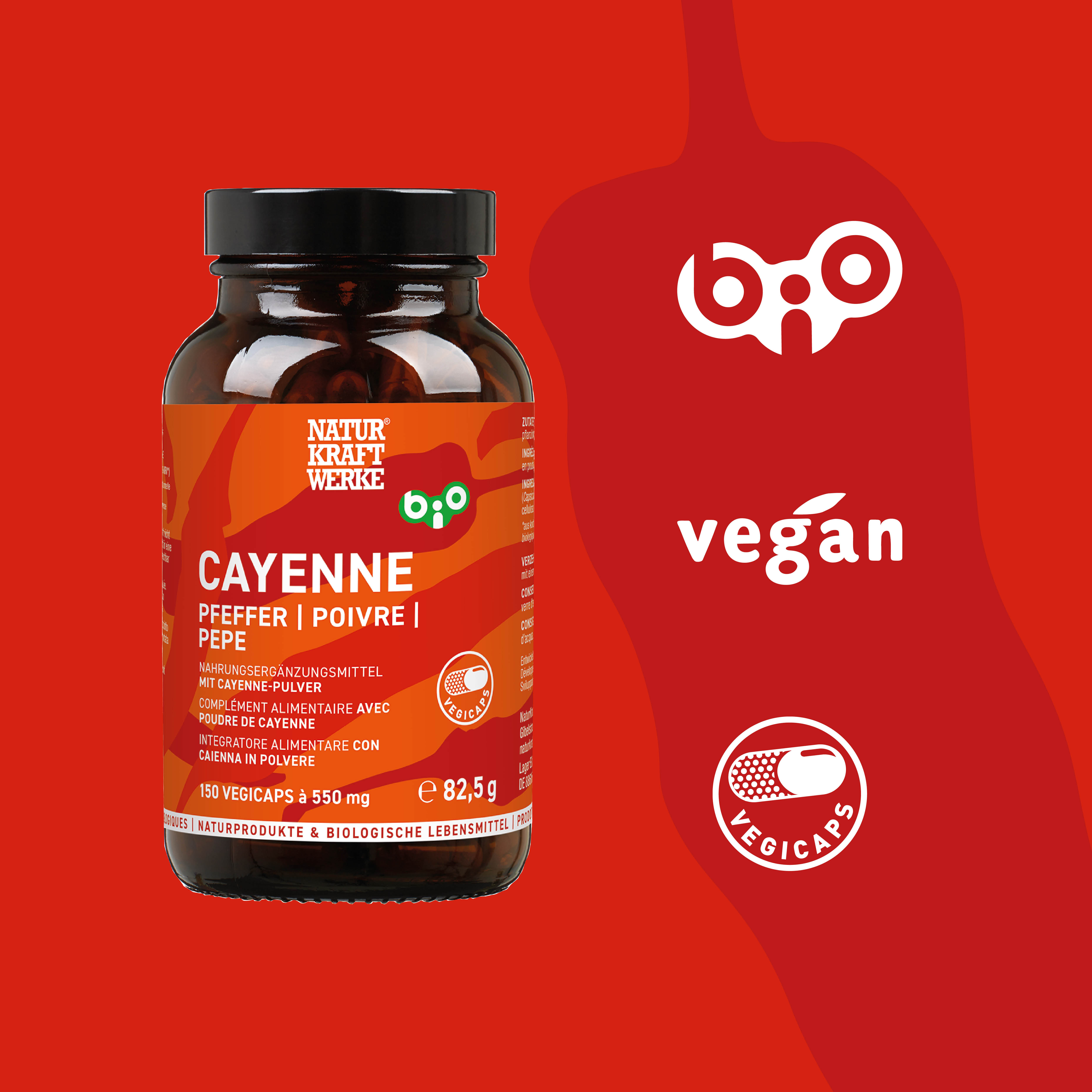 Cayennepfeffer enthält reichlich Capsaicin und Capsaicin ist der Pflanzenstoff, der Chili und Cayenne den grössten Teil ihrer Schärfe verleiht. Das heisst Cayenne heizt dem Körper ordentlich ein. Und zwar auf vielen Ebenen und im positiven Sinne.