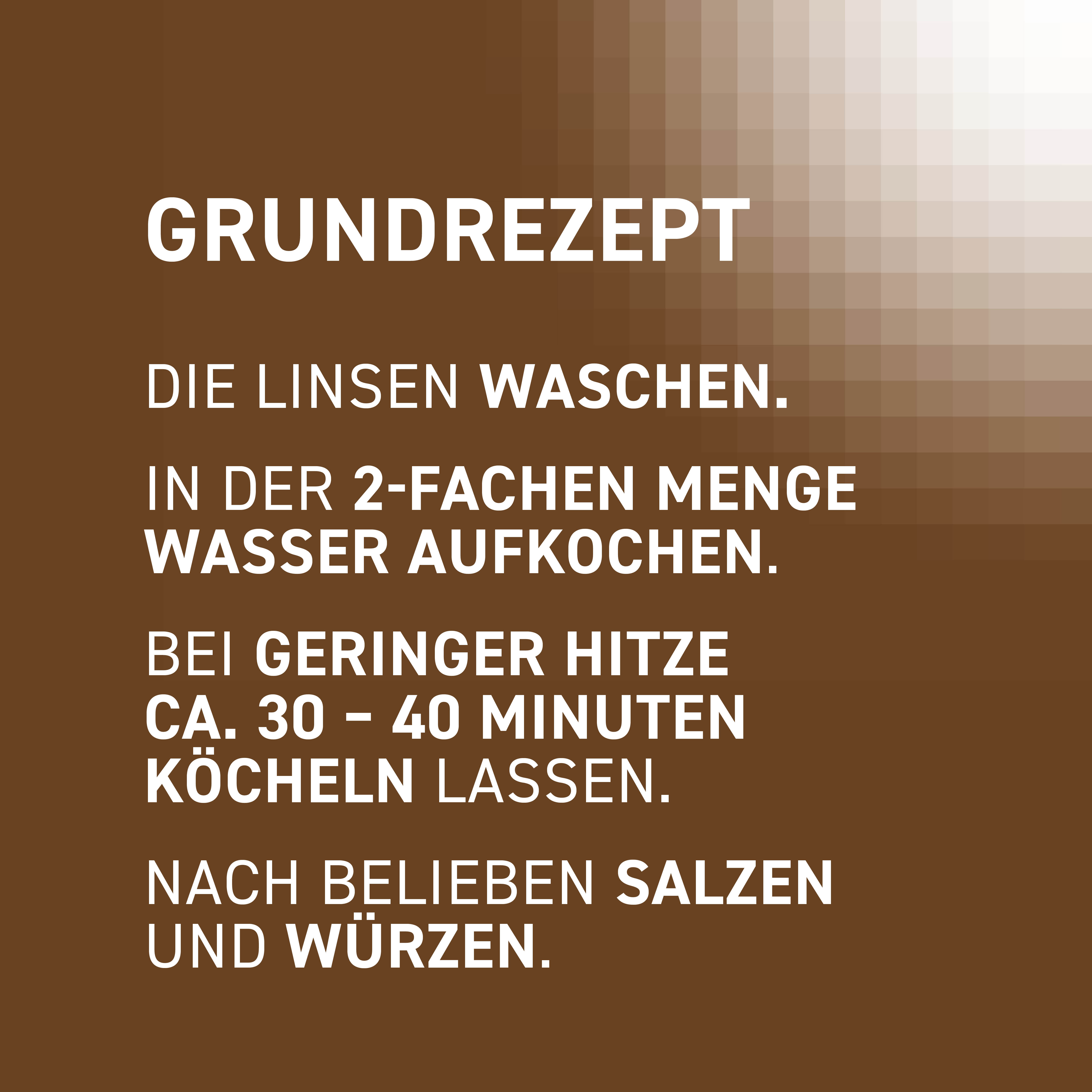 Grundrezept: Die Linsen waschen und in der 2-fachen Menge Wasser aufkochen. Bei geringer Hitze ca. 30,40 Minuten köcheln lassen. Nach belieben salzen und würzen.