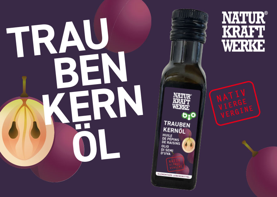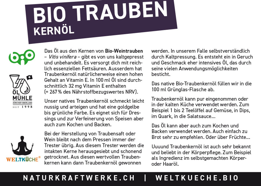 Das NaturKraftWerke Traubenkernöl ist kaltgepresst und naturrein. Die Traubenkerne verleihen diesem Öl einen leicht nussigen Geschmack und ein weinartiges leicht holziges Aroma. Das goldig bis grünliche Öl ist äusserst vielseitig verwendbar.