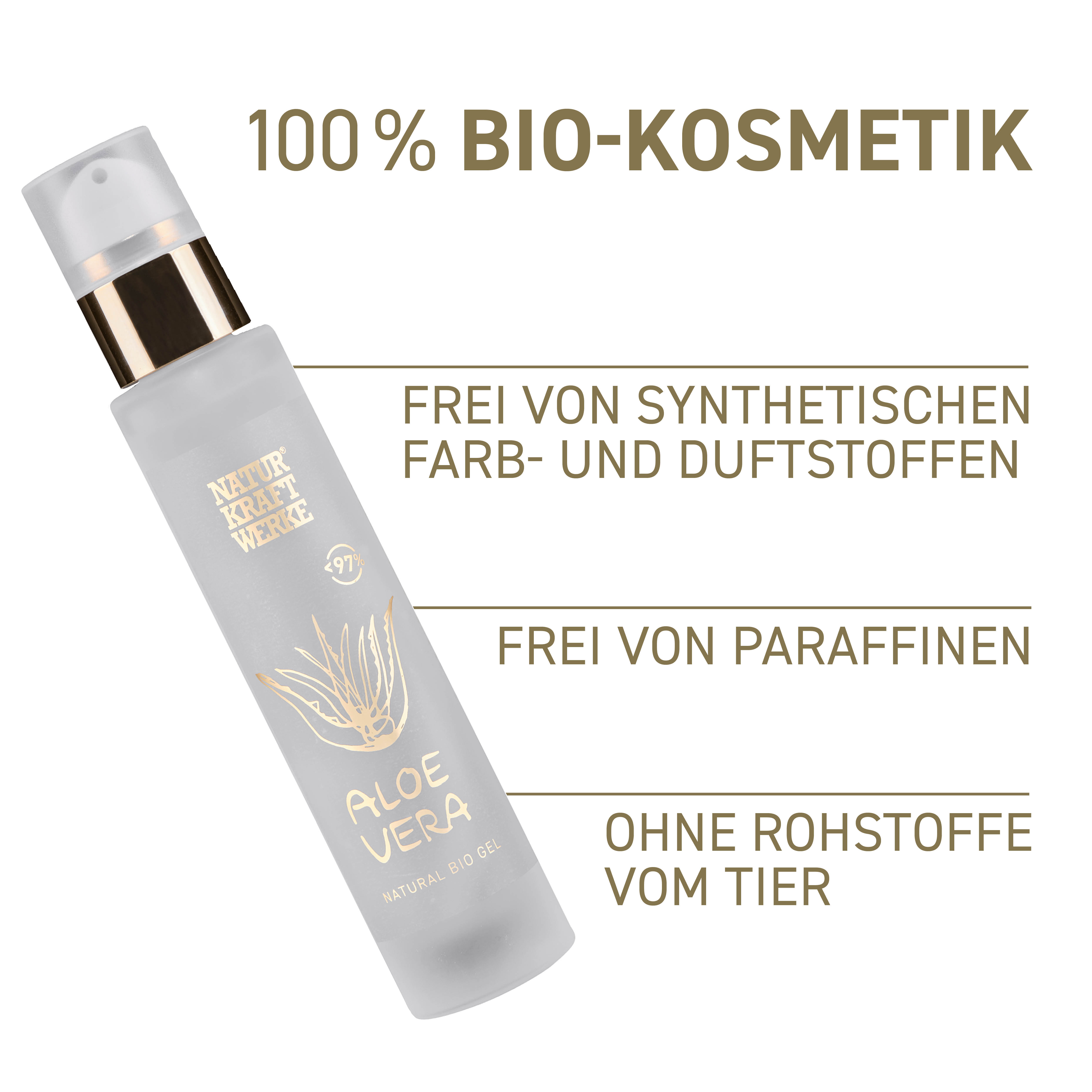 Entstanden ist dieser praktische NaturKraftWerke Aloe Vera Gel Natural. 100 % Bio-Kosmetik. 97,3 % Bio-Aloe-Extrakt. In der Glas-Flasche.