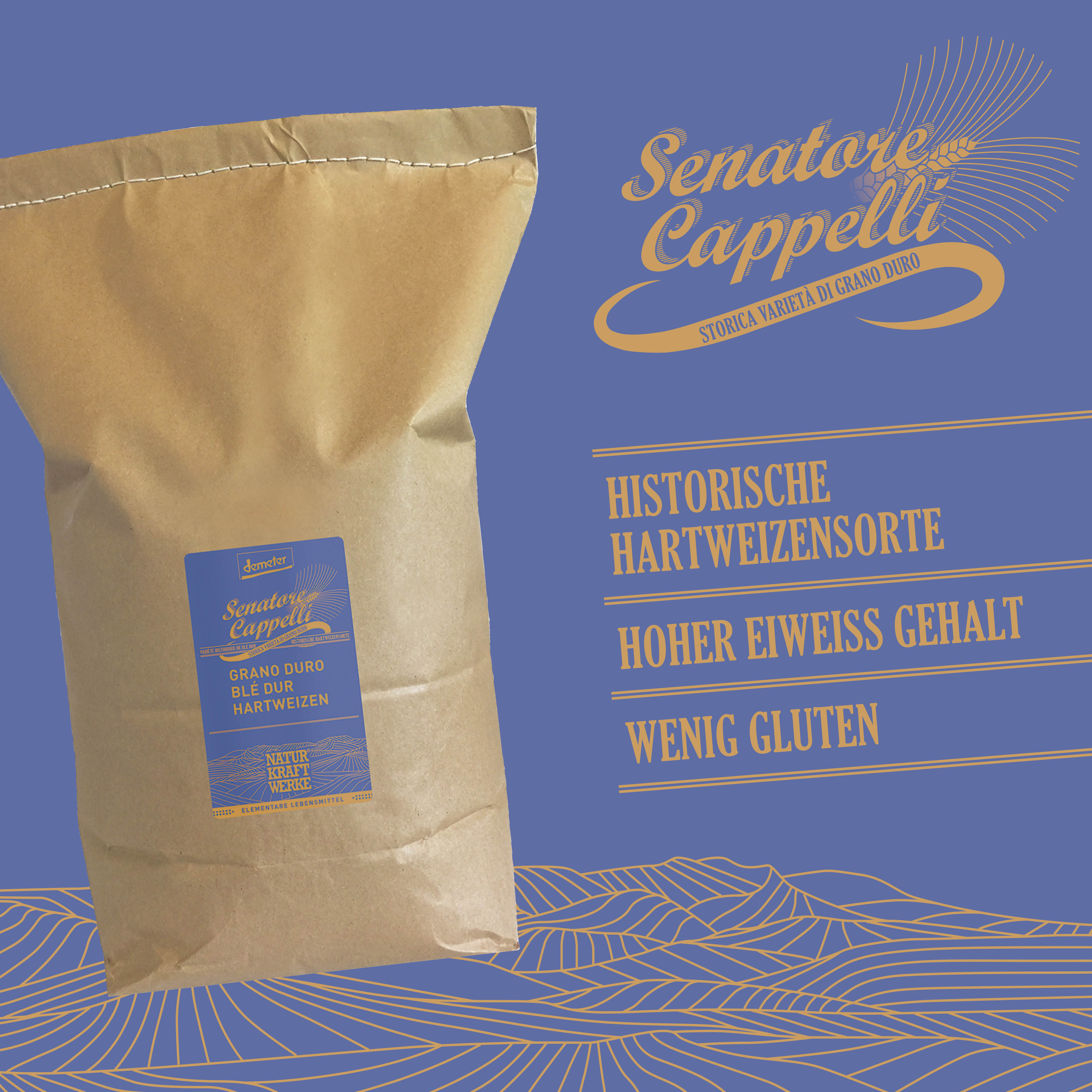 Die Hartweizensorte „Senatore Cappelli" wurde Anfang des 20. Jahrhunderts vom italienischen Agronomen und Pflanzenzüchter Nazareno Strampelli mit der Unterstützung von Senatore Cappelli gezüchtet und kultiviert. „Senatore Cappelli" gilt wegen seiner geschmacklichen Eigenschaften als Königin der Hartweizensorten. Er erreicht eine Halmhöhe von bis 2 m und ist für den Anbau in trockenen Gebieten wie Süditalien und Sizilien besonders geeignet. Der Senatore Cappelli von NaturKraftWerke® gedeiht in der wunderschönen Landschaft der - dem Naturpark delle Madonie zugehörigen - Kommune Petralia Sottana in Sizilien.