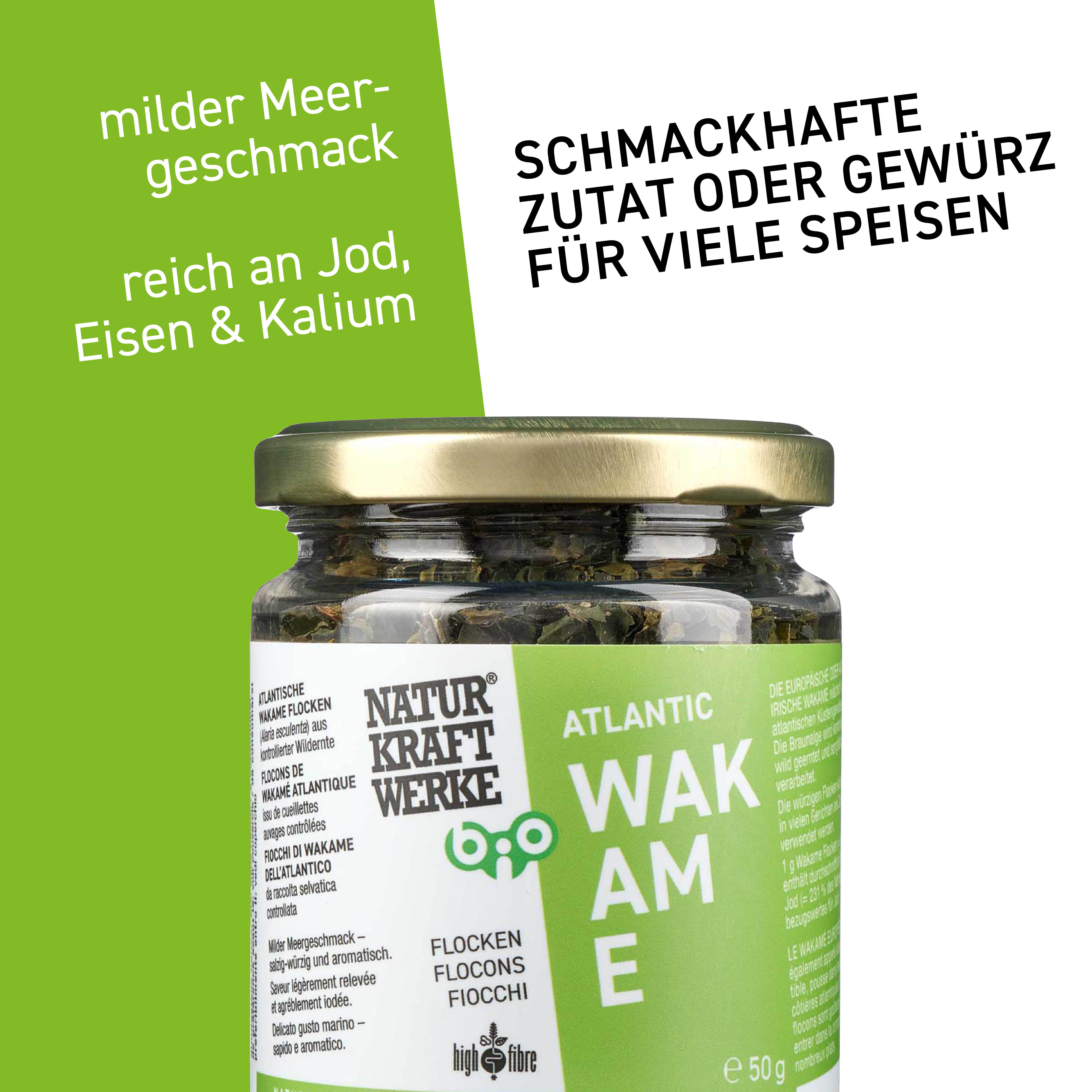 Die NaturKraftWerke Wakameflocken kommen aus irischen und färöischen Gewässern. Atlantische Wakamealgen sind eine schmackhafte Zutat für viele Speisen. Die Flocken können einfach über fertige Speisen wie zum Beispiel Nudelsuppen gestreut werden. Auch leicht geröstet oder kurz eingeweicht lassen sie sich zubereiten.