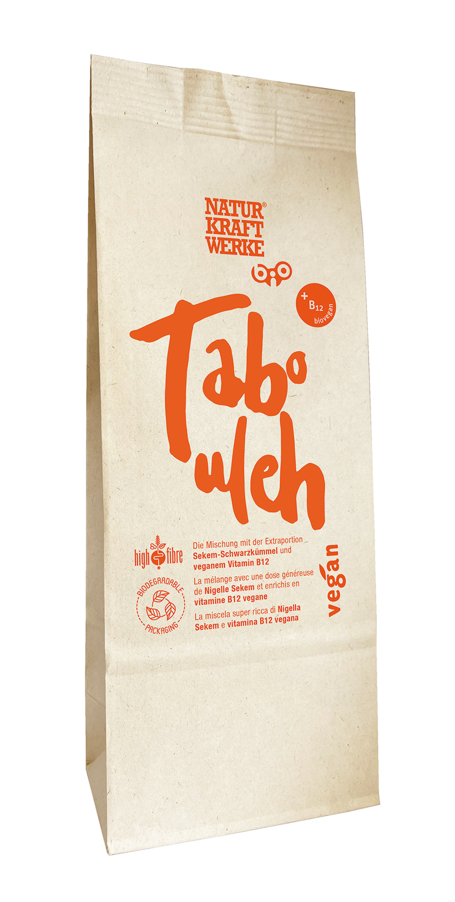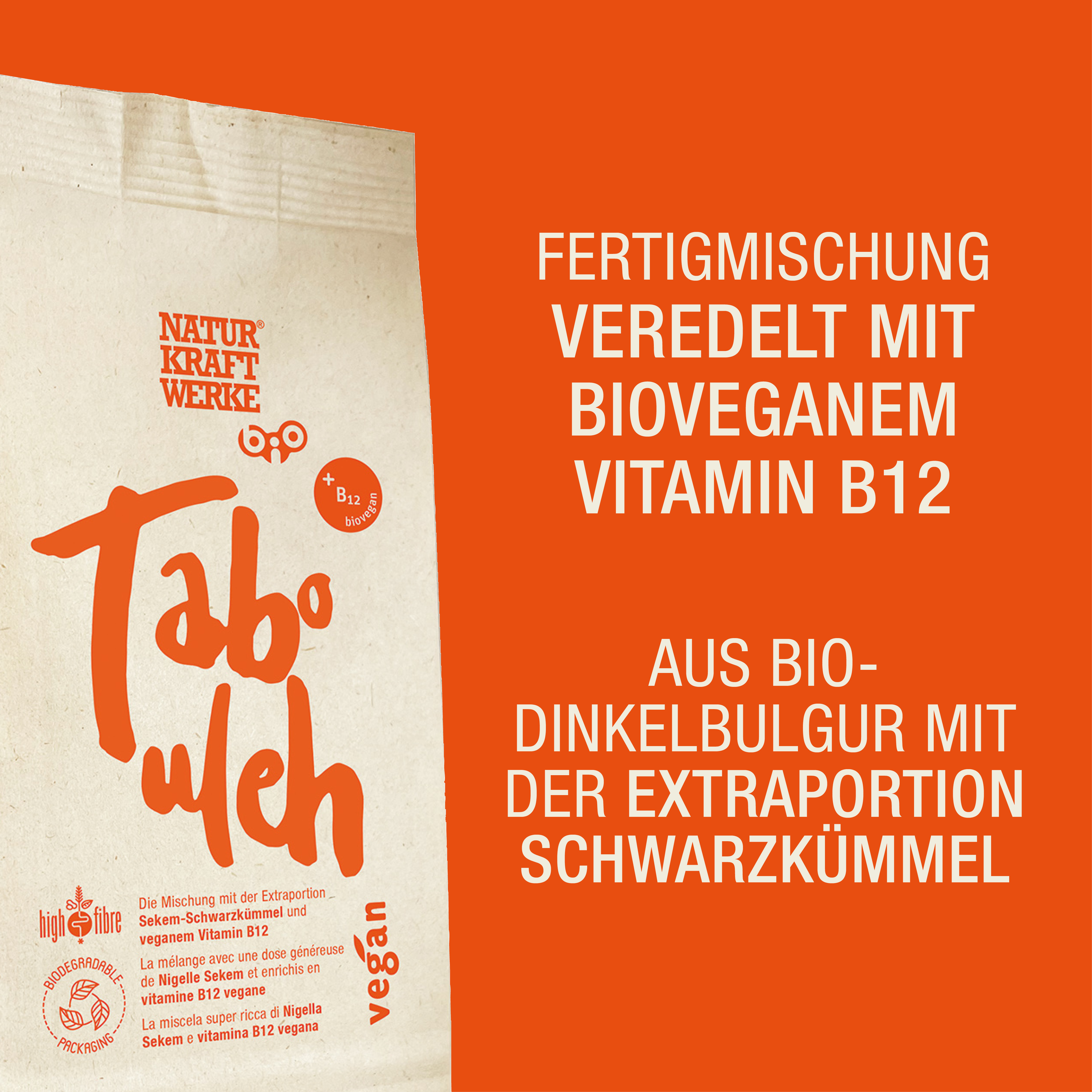 Die Tabouleh Fertigmischung von NaturKraftWerke besteht aus Dinkelbulgur, getrockneter Tomate, Zwiebeln, Petersilie, ausgesuchten Gewürzen und einer Extraportion Demeter Schwarzkümmel.