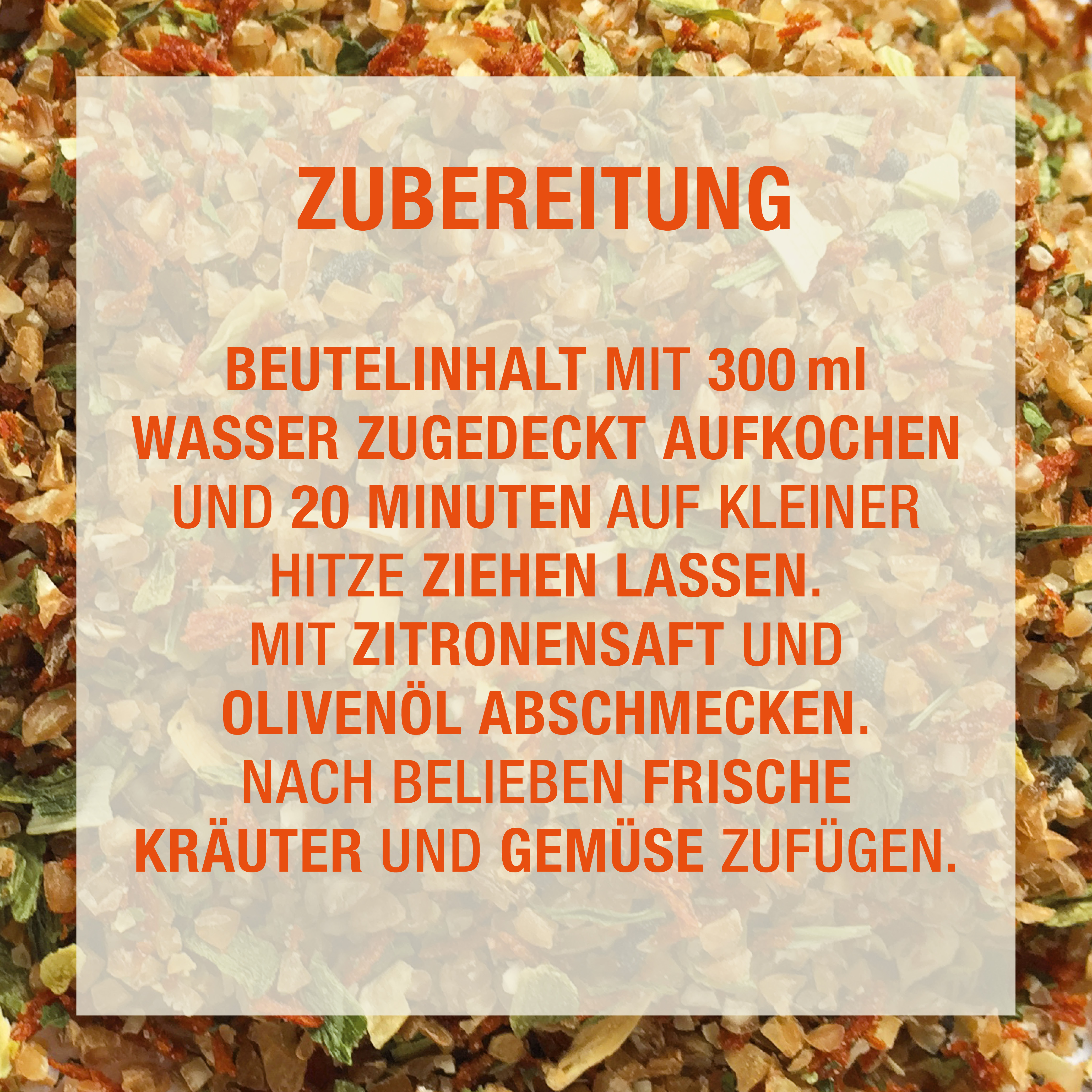 Beutelinhalt mit 300 ml Wasser zugedeckt aufkochen und 20 Minuten auf kleiner Hitze ziehen lassen. Mit Zitronensaft und Olivenöl abschmecken. Nach Belieben frische Kräuter und Gemüse zufügen.