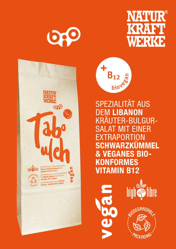 Die Naturkraftwerke Tabouleh Fertigmischung veredelt mit bioveganem Vitamin B12. Das Tabouleh ist einfach und schnell zubereitet und liefert viele wertvolle Nährstoffe. Als schnelles Gericht oder als Beilage.