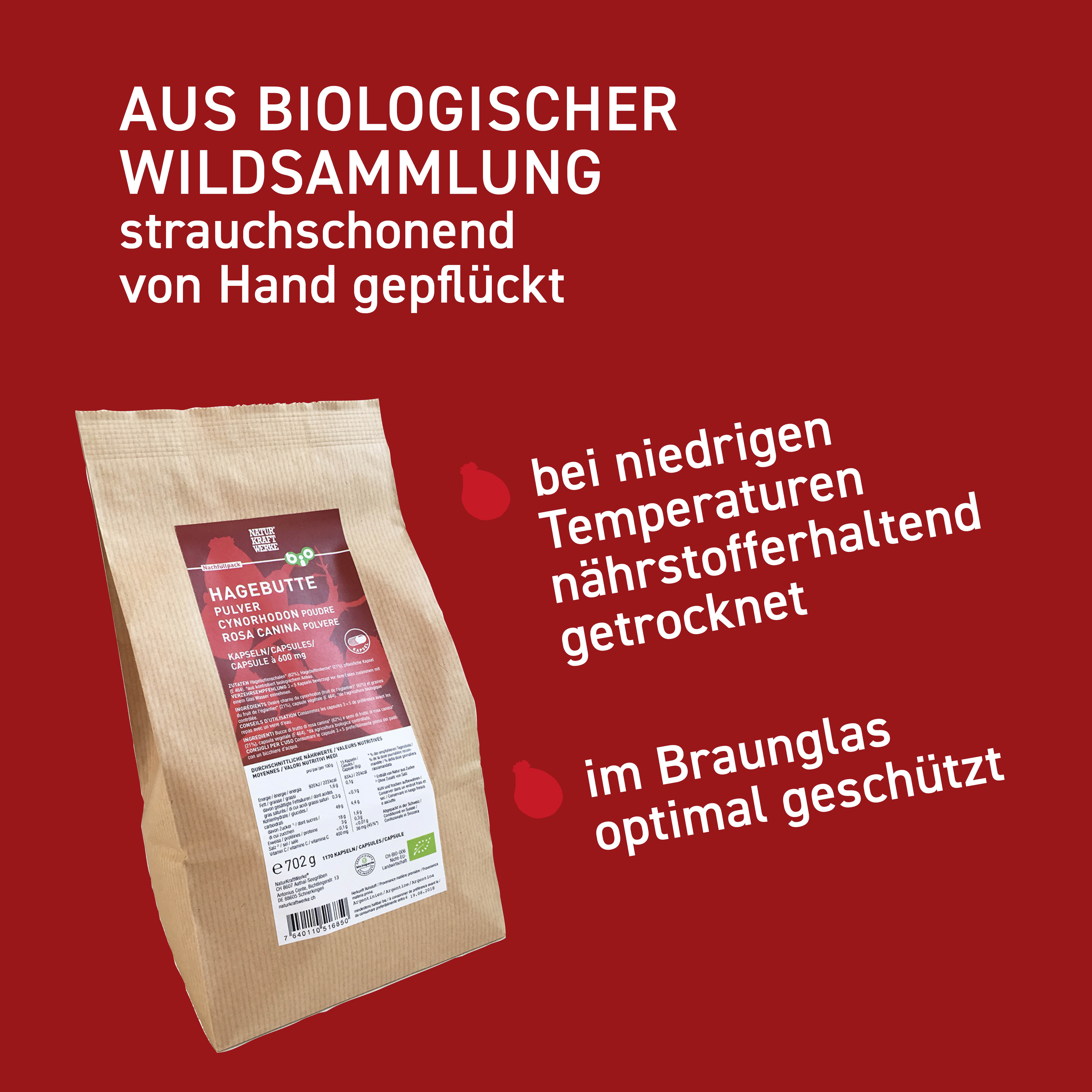 - 100 % Rosa canina Fruchtpulver in pflanzlichen Cellullosekapseln