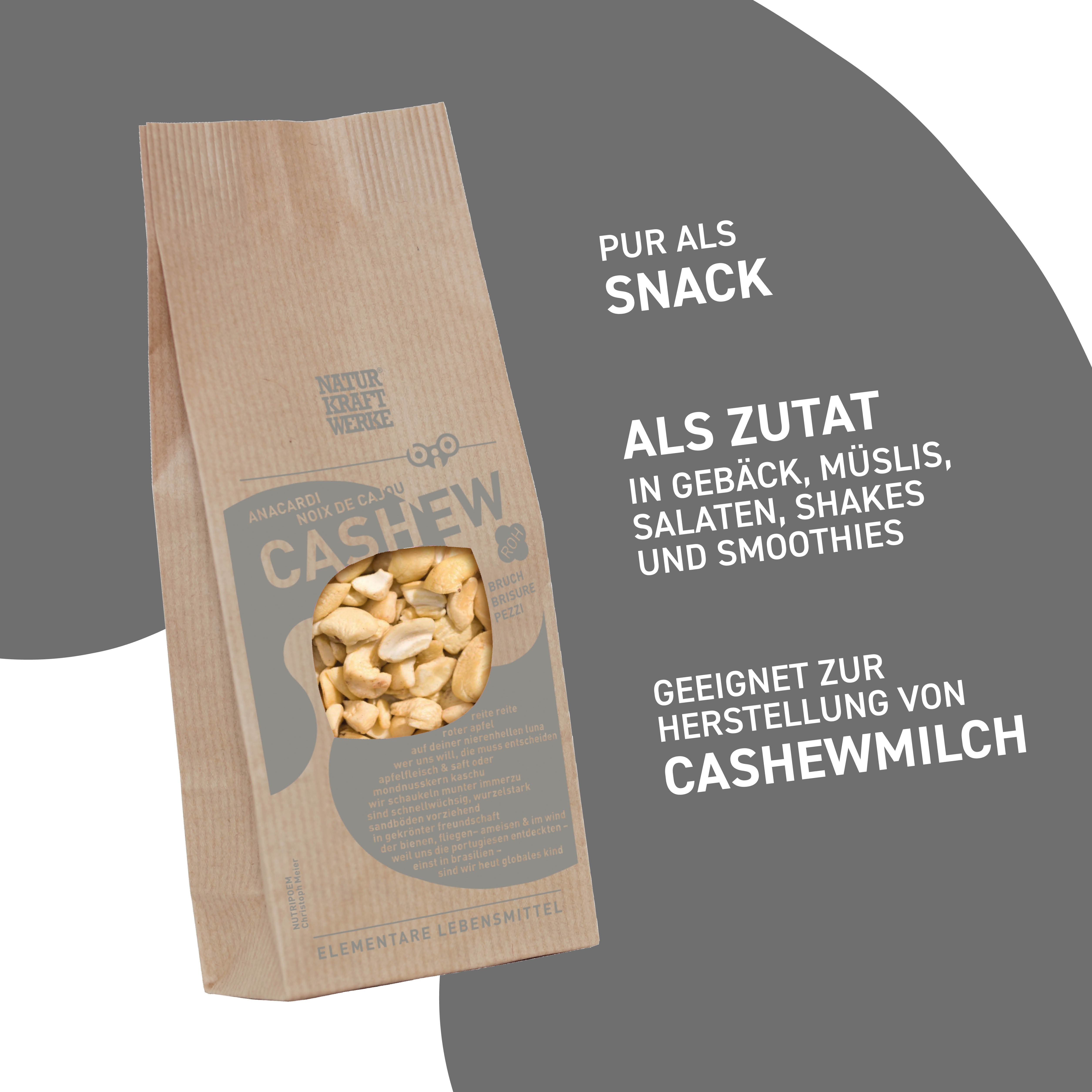 Pur als Snack oder als Zutat in Gebäck, Müslis, Salaten, Shakes, Smoothies und vielen anderen Gerichten. Für die Herstellung von Cashewmilch oder Cashew-Käsezubereitungen bestens geeignet.